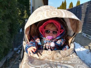 A kislányunk látta, hogy ha mindannyian kimegyünk az utcára akkor felvesszük a napszemüvegünket. Eleinte csak sapkát hordott, de mivel nem viselte el sokáig meleg is volt alatta, megizzadt, nem volt más választásunk, mint megtanítani neki a napszemüveg viselését.