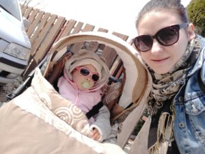 A kislányunk látta, hogy ha mindannyian kimegyünk az utcára akkor felvesszük a napszemüvegünket. Eleinte csak sapkát hordott, de mivel nem viselte el sokáig meleg is volt alatta, megizzadt, nem volt más választásunk, mint megtanítani neki a napszemüveg viselését.